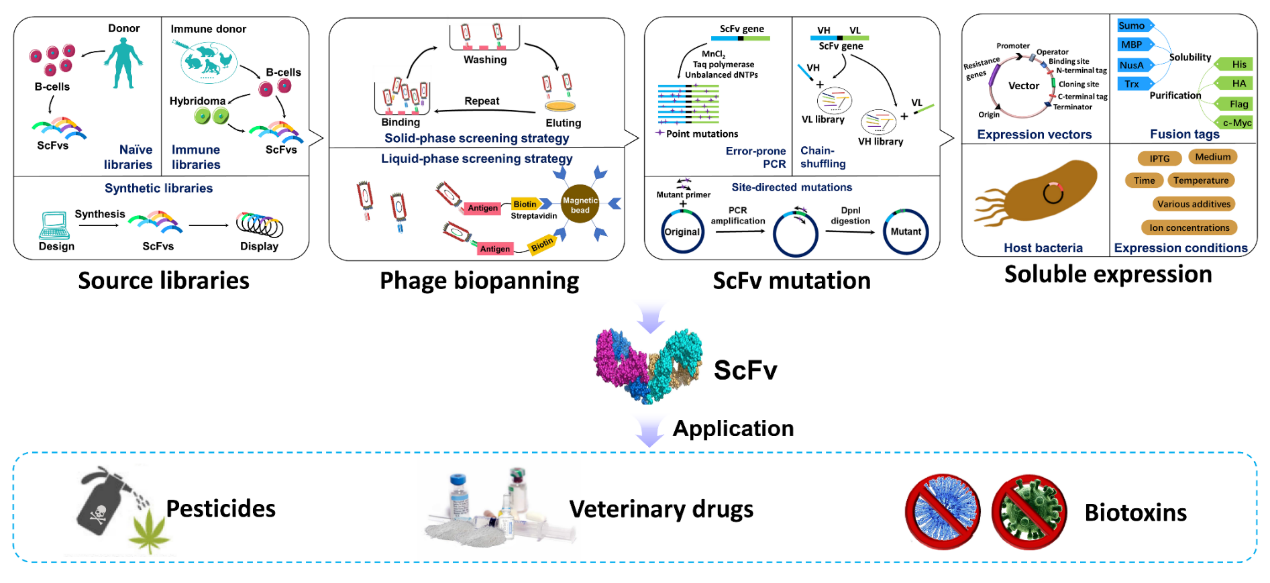 彭大鹏教授课题组在Comprehensive Reviews in Food Science and Food Safety在线发表了题为“Single-chain Fragment Variable Produced by Phage Display Technology: Construction, Selection, Mutation, Expression and Recent Applications in Food Safety”的综述论文。该论文基于团队前期对吉他霉素,泰乐菌素等特异性scFv的研究(相应成果已发表在Food Chemistry和Food Control上),深入分析了应用噬菌体展示技术制备scFv的各个关键环节,包括不同噬菌体展示文库的构建,不同生物淘筛方案的设计,不同亲和力成熟策略的实施,原核表达技术的选择等方面,并且讨论了每个环节中要面临的挑战和可能的解决方案。最后,总结了近年来scFv在农药、兽药和生物毒素检测中的应用,并为它们的发展趋势提供了新见解。