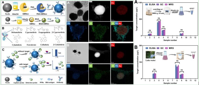 王玉莲副教授课题组在 Journal of Hazardous Material(IF=14.224)发表了题为“Broad-spectrum portable magnetic relaxation switching immunosensor with gold-functionalized magnetic nanoprobes for the sensitive detection of multiple pyrethroids”的研究论文。该论文构建了一系列不同粒径的新型的金功能化、广谱MRS生物传感器,引入广谱抗体CL-CN/1D2作为识别元件,实现了对8种拟菊酯类农药(PYRs)的特异性识别(图左),提出新型的金功能化MRS传感器,与传统MRS相比,金功能化广谱MRS生物传感器具有更强的光学、磁性、催化性能和热稳定性,突破传统MRS免疫传感器检测光谱窄、疏水性分析物稳定性差的局限性。该传感器利用磁性纳米粒子和金纳米粒子的优势,在牛奶和湖水中,能够在35min内多次检测PYRs,具有高灵敏度和高稳定性。
