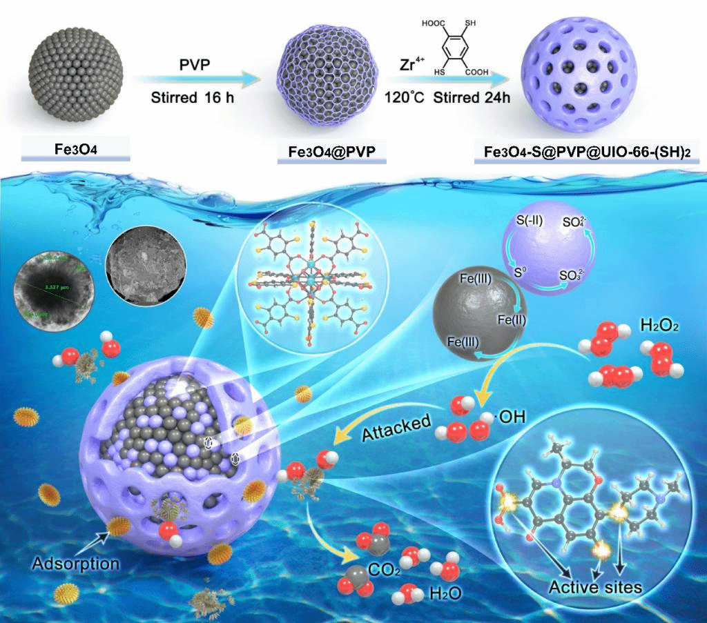 精准兽药创制与环境消减技术开发团队设计了具有核壳结构和硫掺杂特征的多功能金属有机骨架材料,实现了对抗菌药物的高效吸附和协同降解。相关成果以“S-doped core-shell heterojunction Fenton catalyst (Fe3O4-S@PVP@UIO-66-(SH)2) for enhanced activation of hydroxyl radical: synergistic enrichment and degradation mechanism”为题发表在Chemical Engineering Journal上。本研究通过在四氧化三铁团簇内外同时生长巯基化锆基金属有机骨架,构建了具有高效吸附性和过氧化氢活化性能的多相芬顿催化纳米材料,同时结合理论计算与试验结果系统地探究了引入非金属克服铁活性位点失活的机制。