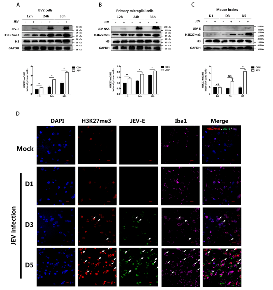 图1. JEV感染引起小鼠小胶质细胞系BV2、原代胶质细胞和小鼠脑组织中H3K27me3水平上调