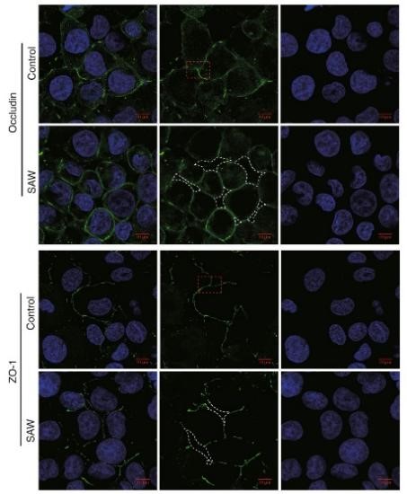 研究发现PCB-AFB通过声辐射和声流体作用于BBB。SAW在一定程度上呈现作用时间和作用功率的依赖性。SAW的刺激几乎不影响人脑微血管内皮细胞的细胞活性,不改变紧密连接蛋白的表达,但改变了邻近细胞紧密连接蛋白的分布,扩大内皮细胞的细胞间隙,从而增加了BBB对小分子物质(NaF,376 dalton)和大分子物质(FITC-Dextran-10 kD,FITC-Dextran-70 kD)的通透性。SAW刺激BBB后,经过一段时间BBB功能可以自行恢复。该研究提示,通过控制SAW的作用功率,可以实现可逆地开关BBB,实施CNS药物的精准递送。