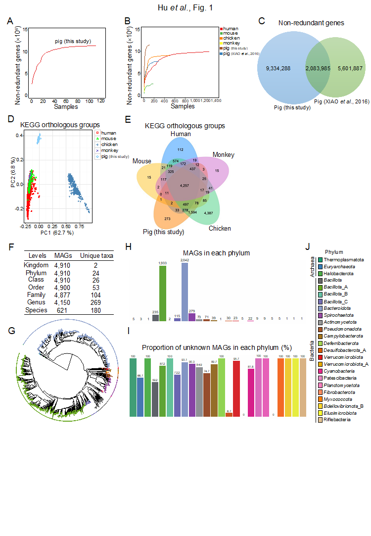 研究人员综合运用宏基因组学和细菌16S rDNA扩增子测序技术系统解析了7个品种猪(即杜×(长×大)猪、藏猪、莱芜猪、沙子岭猪、从江香猪、环江香猪和宁乡猪)共计56头断奶仔猪和56头育肥末期猪的肠道微生物区系组成。鉴定了11418273个非冗余肠道微生物基因,通过与已发表文献的非冗余肠道微生物基因进行整合,本研究构建了包含17020160个非冗余基因的猪肠道微生物基因集,通过对宏基因组组装数据进行分箱,共重构获得了4910个非冗余原核微生物基因组。研究表明我国地方猪肠道微生物的营养物质(包括脂类、氨基酸、碳水化合物和核苷酸)代谢能力和能量代谢能力比杜×(长×大)商品猪更强。杜×(长×大)商品猪肠道微生物的抗生素抗性基因丰度比中国地方猪更高,研究发现品种和日龄是影响猪肠道微生物区系组成和功能的关键因素。综合评估微生物的出现率、微生物相对丰度和猪生长阶段,利用宏基因组学和细菌16S rDNA扩增子测序共鉴定出3种猪肠道核心优势细菌(Phascolarctobacterium succinatutens、Prevotella copri和Oscillibacter valericigenes),结果表明灌服上述3种核心优势细菌可显著增加无菌小鼠的器官指数(包括心脏、脾脏和胸腺),降低胃肠道的长度,增强肠道上皮屏障功能,增加肠道的隐窝深度,同时上述3种核心优势细菌可显著改变无菌小鼠的营养物质代谢过程(包括初级胆汁酸的生物合成、苯丙氨酸、酪氨酸和色氨酸的生物合成、苯丙氨酸的代谢等)。综上,本研究系统性解析了7个品种猪的肠道微生物的组成与功能,筛选出猪肠道微生物核心优势细菌并证明了其对无菌小鼠器官指数、肠道屏障功能、肠道黏膜形态和营养物质代谢的关键调控作用,为实施肠道菌群干预改善猪生长与肠道健康提供理论依据和新资料。