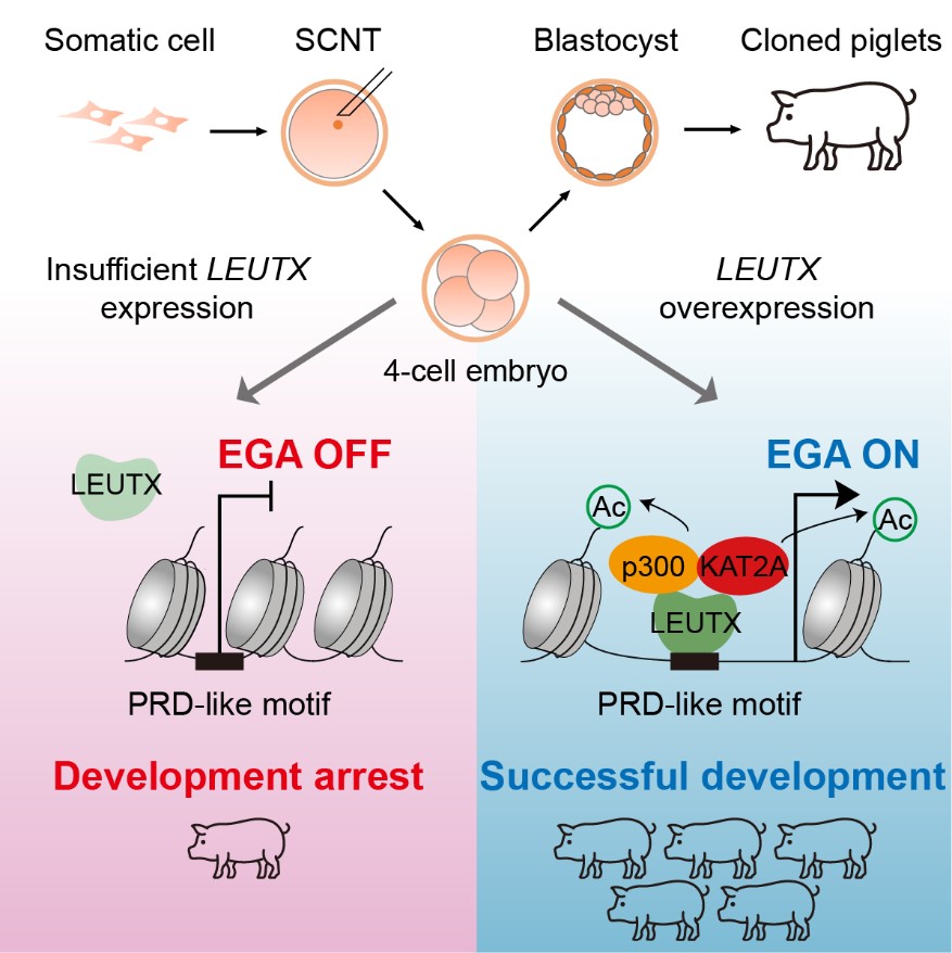 苗义良教授领衔的动物克隆与干细胞研究团队在Cell Reports发表了题为“LEUTX regulates porcine embryonic genome activation in somatic cell nuclear transfer embryos”的最新研究成果。该研究全面系统地揭示了猪特异性转录因子LEUTX对体细胞重编程的调控机制,并为提高猪的克隆效率提供了新方法。
