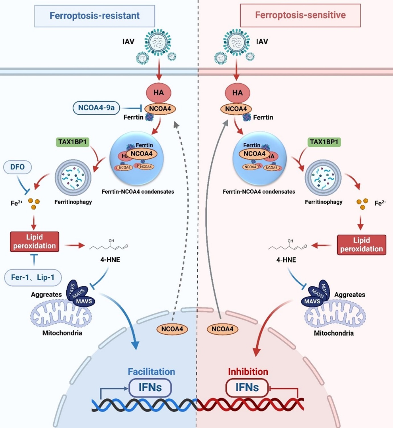 本研究揭示了IAV血凝素蛋白诱导铁自噬导致细胞脂质过氧化,抑制MAVS介导的抗病毒免疫的新机制,为抗IAV策略的开发提供了潜在的靶标。