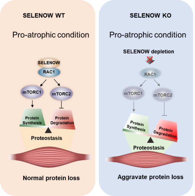 本研究揭示了SELENOW缺失通过抑制RAC1-mTOR级联加剧肌肉萎缩。研究结果为合理应用硒防控畜禽NMD提供了新的科学依据,也为预防和治疗人类肌肉萎缩提供了潜在的靶点。