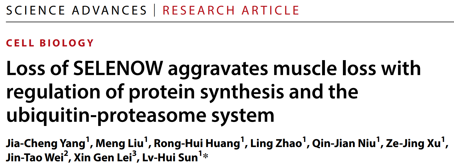 农业微生物资源发掘与利用全国重点实验室、动物育种与健康养殖前沿科学中心、湖北洪山实验室、动科动医学院孙铝辉教授课题组在《Science Advances》期刊上发表了题为“Loss of SELENOW aggravates muscle loss with regulation of protein synthesis and ubiquitin-proteasome system”的研究论文。该研究首次揭示了硒蛋白W(SELENOW)在肌肉萎缩中的重要功能及机制。