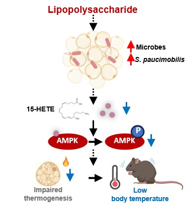生猪在我国农业生产中占据十分重要地位,直接关乎老百姓的“肉盘子”。在生猪饲养过程中,易发出生后发育迟缓问题,具体表现为生产性能不佳,饲料转化率低下,并伴有高死淘率,这极大增加饲养成本,严重制约养猪业的高质量发展。而目前对于生长迟缓猪的形成原因及具体机制尚不明确。课题组通过前期进行大规模仔猪生长跟踪试验,建立了仔猪出生后生长迟缓模型,揭示猪脂肪组织内菌群鞘氨醇单胞菌(Sphingomonas paucimobilis)是导致猪生长发育迟缓和代谢紊乱的关键因素之一,并阐明S. paucimobilis菌群通过破坏仔猪膜磷脂代谢,抑制脂肪细胞能量代谢,进而导致生长受阻的作用机制(Song et al., Life metabolism,2024;封面文章)。但脂肪菌群调控脂肪细胞能量代谢的作用机制仍不明晰。