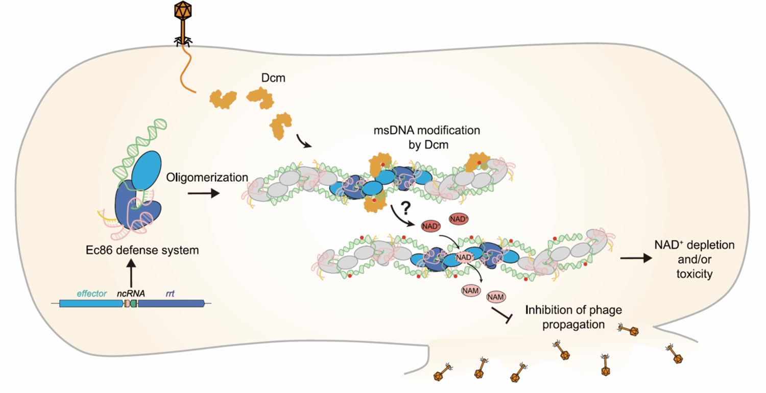 本研究聚焦大肠杆菌Retron Ec86(Eco1)系统,发现噬菌体编码的DNA胞嘧啶甲基转移酶(Dcm)是Ec86系统的激活因子,并且证实Dcm能够通过甲基化msDNA中的胞嘧啶,激活Retron Ec86系统。冷冻电镜结构解析发现,Ec86系统的逆转录酶、msDNA和效应蛋白共同形成多聚化丝状结构,该丝状结构具有NAD+水解活性,通过耗竭细菌中的NAD+,在子代噬菌体完成组装之前诱导细菌自杀,从而实现抗噬菌体的防御功能(图1)。本文研究揭示了Retron Ec86的激活及其抗噬菌体感染的详细机制,深化了对细菌防御系统的理解,为Retron系统在基因组编辑中的应用提供了理论指导。