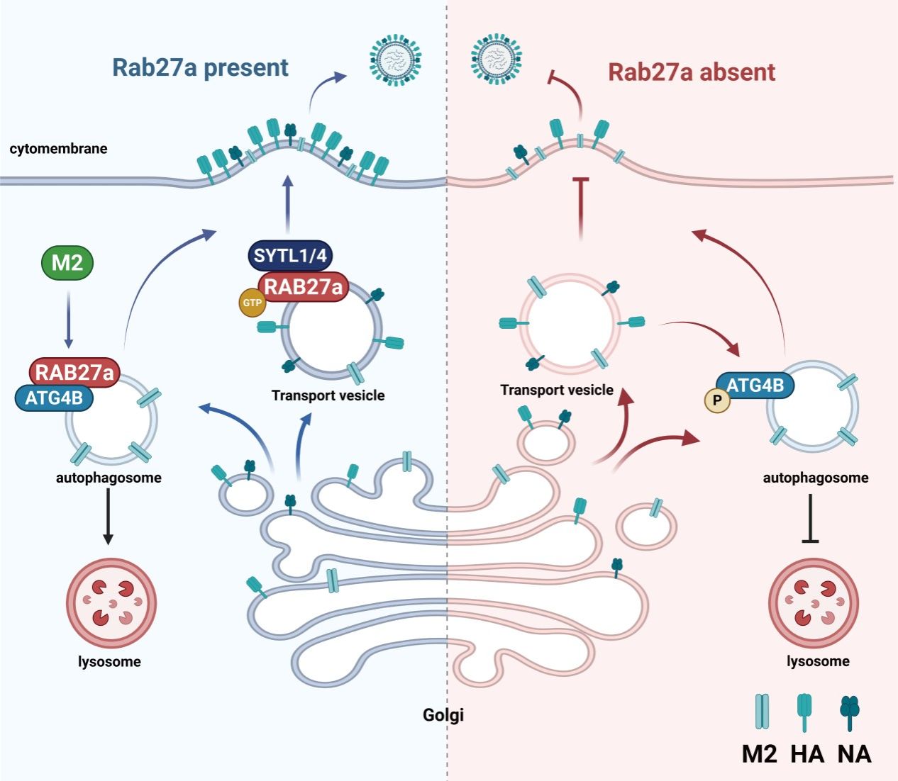 该研究揭示了Rab27a及其效应分子SYTL1、SYTL4在流感病毒膜蛋白向质膜运输中的关键作用,填补了当前对流感病毒生命周期中膜蛋白运输领域研究的空白,为抗流感病毒药物研发提供了重要靶点。