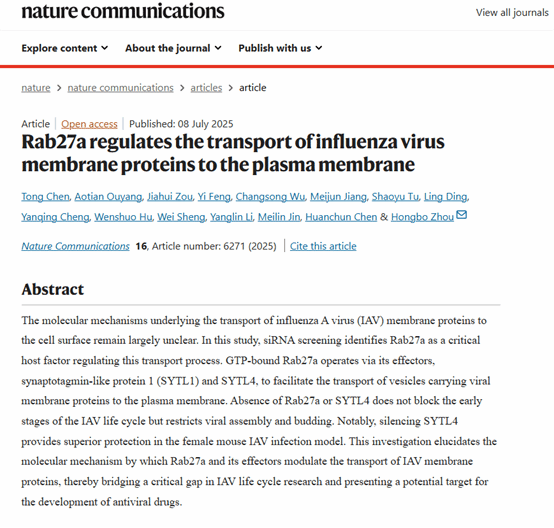 农业微生物资源发掘与利用全国重点实验室、动物育种与健康养殖前沿科学中心、湖北洪山实验室、动物医学院周红波教授团队在Nature Communications期刊上发表了题为“Rab27a regulates the transport of influenza virus membrane proteins to the plasma membrane”的研究论文,揭示了流感病毒膜蛋白合成后向出芽位点运输,进而参与病毒颗粒组装出芽的分子机制。
