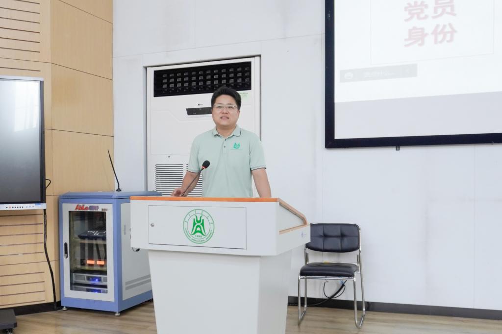 大会第三项,动物科学本科生第一党支部副书记、优秀毕业生党员代表范鑫分享发言。范鑫从自身的入党历程、参加的党组织活动以及担任的相关职务等经历讲起,强调党员不仅需要学习相关理论知识,更要在党的教育下坚定理想信念,始终明确党员身份。