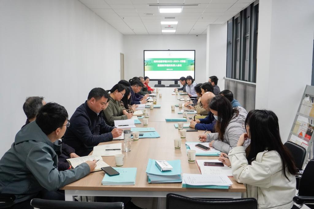 在四综D202会议室召开2022-2023-2学期教研室负责人研讨会。会议回顾总结过去一年基层教学组织运行情况,就新年度完善教学评价体系、提高教学质量问题进行研讨。学院副院长任竹青、教务秘书卢禧东和各教研室主任参加会议。
