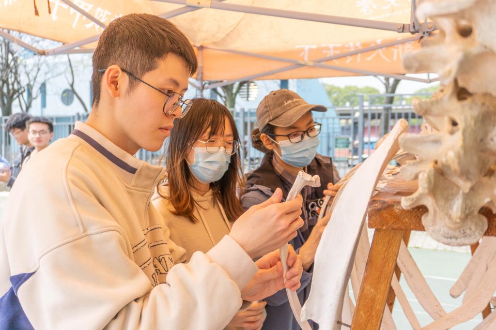 骨骼拼装环节,工作人员在赛场提前准备好了木架和一副完整的牛骨,专业组和兴趣组的同学需分别在10分钟、15分钟内完成比赛。正式拼装开始前,每个小组均有五分钟的自由观察时间,这时的选手们或是站立沉思,或是直接动手尝试。观察时间过后,工作人员会将骨骼随机打乱。但选手们却毫不慌张,凭借着完备的专业知识与默契的团队合作,最终将一副零散的牛骨拼接成功。