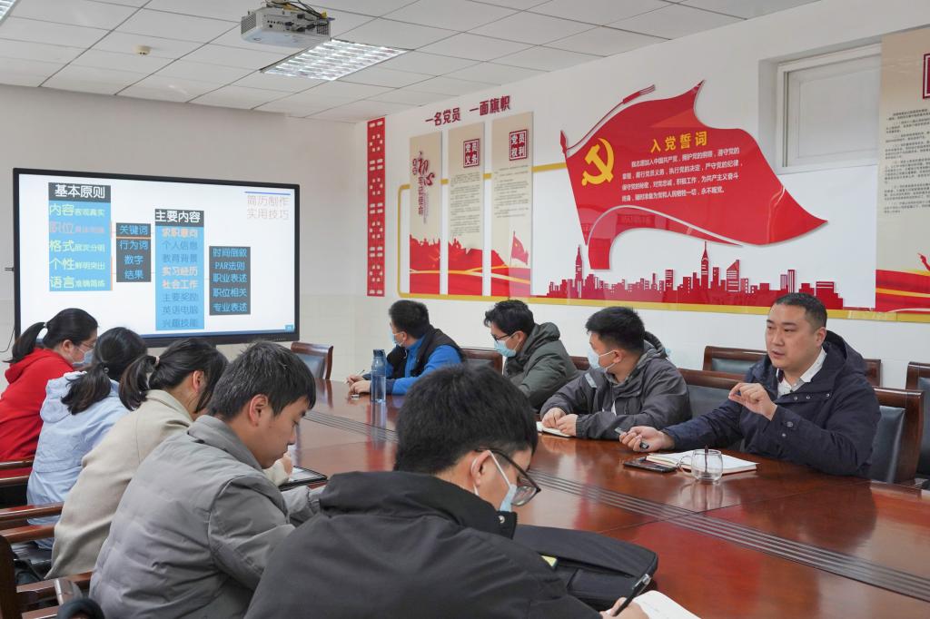 会议伊始,王运涛向在场毕业生分析了当前本行业的就业形势,并介绍了相关企业的薪资待遇情况。他强调要树立正确就业观,“基层不要怕,但不能沉迷基层,只有如此,我们才能为自己就业生涯带来更多的发展机遇,实现人生价值。”谈及简历制作,他认为,一份优秀的简历应当做到格式规范、内容饱满、条理清晰并拥有数据支撑。针对就业方向的选择问题,程唐煜指出“定位”的重要性。“在选择就业岗位时,应多从个人兴趣爱好以及价值观等方面考虑,找到适合自己的职场‘靶点’。”会议最后,两位辅导员分别就各位毕业生的就业简历进行指导。