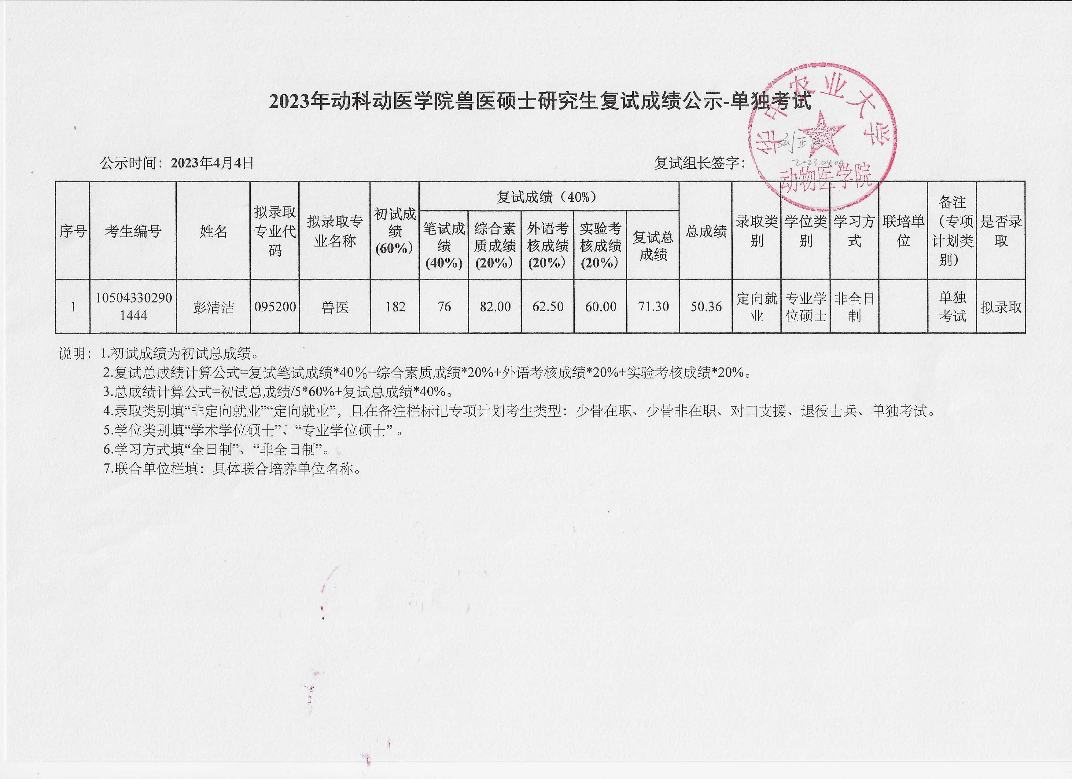 农业硕士(畜牧)复试成绩公示-士兵计划