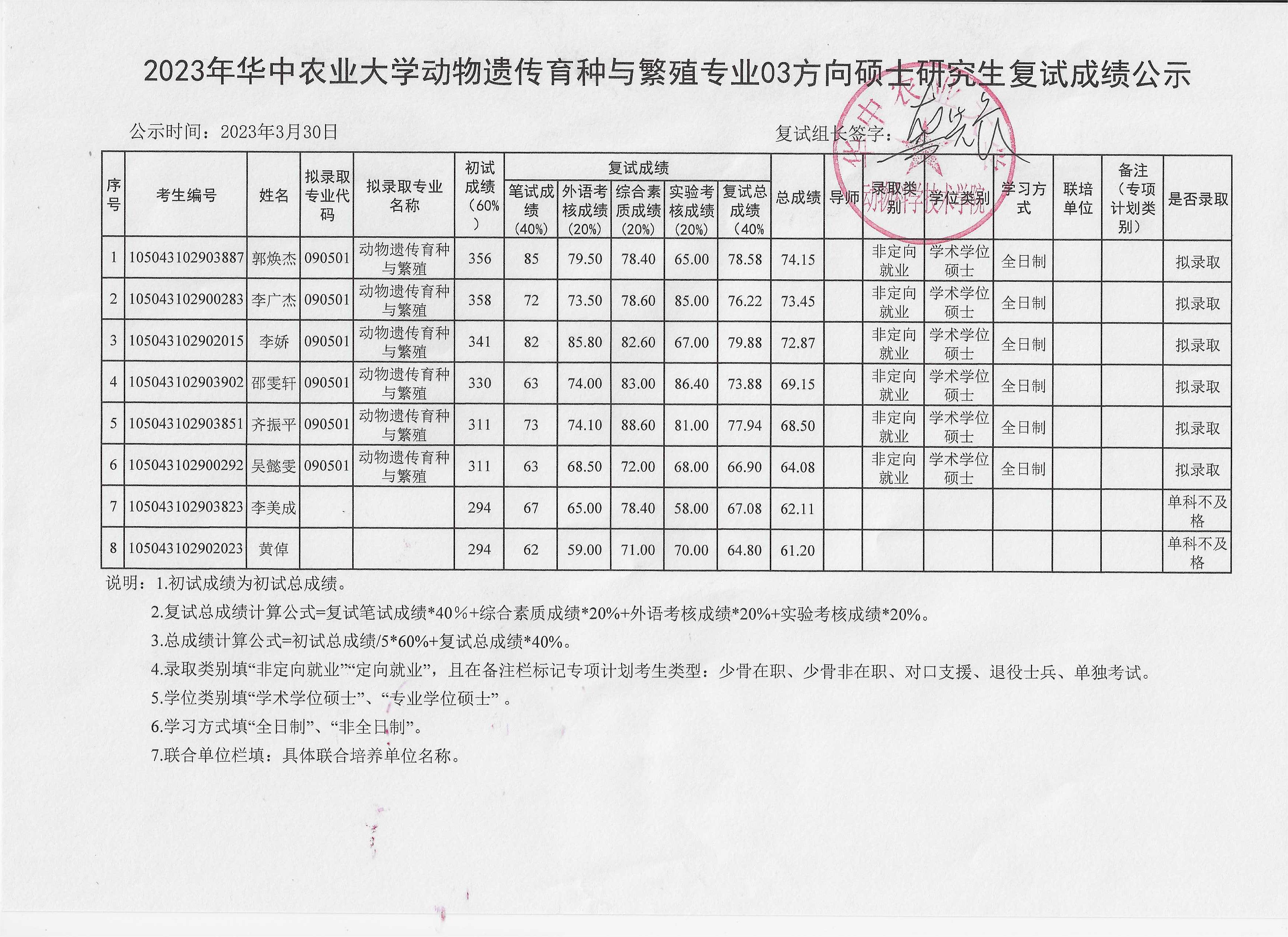动物遗传育种与繁殖专业03方向复试成绩公示