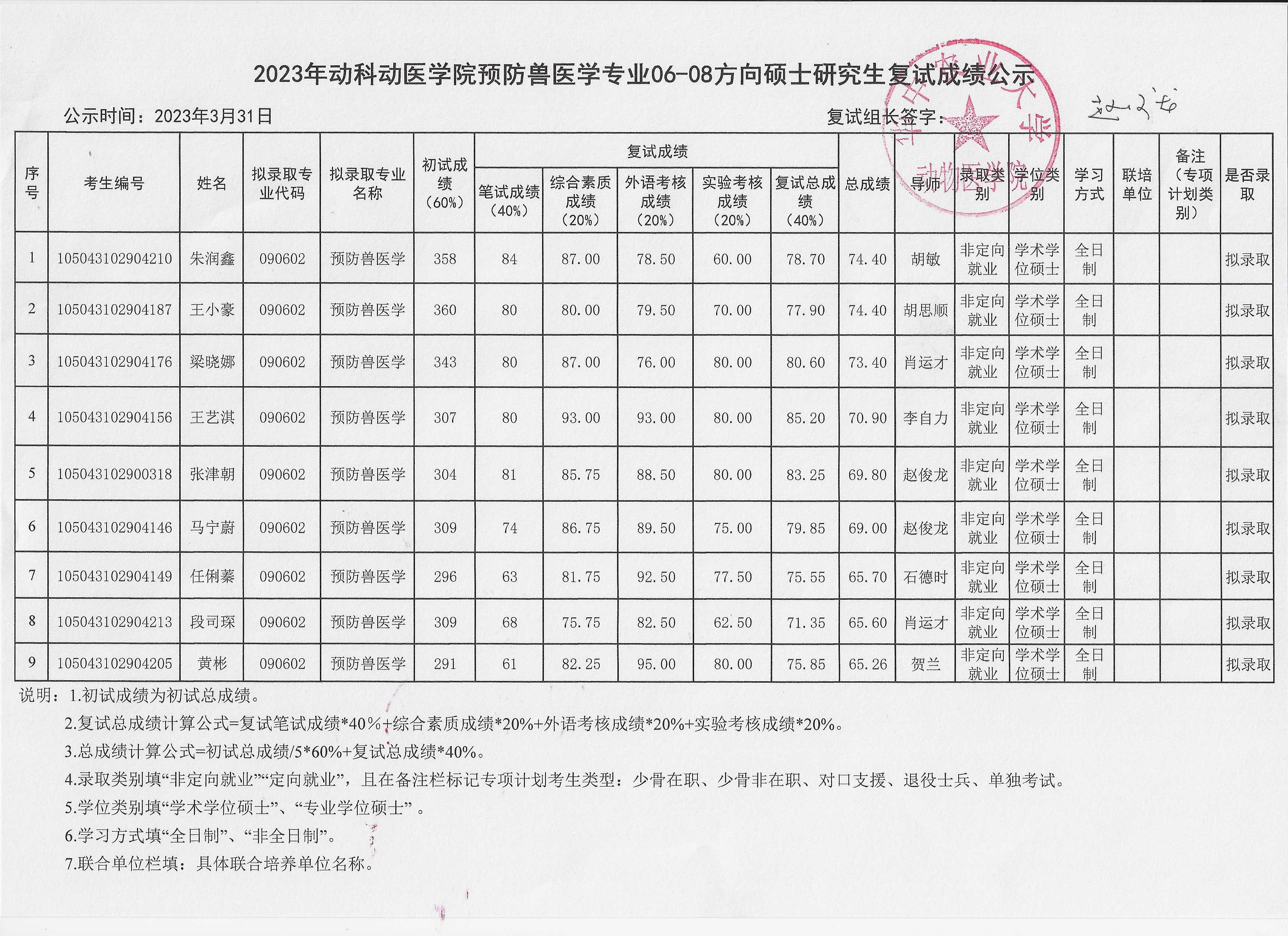 预防兽医学专业06-08方向招生调剂复试成绩公示