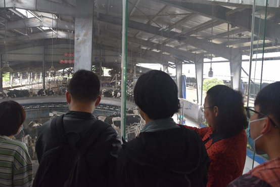 师生参观公司展厅,介绍奶牛场的整体布局,接着带领同学们在观光通道参观牛棚、挤奶厅和生鲜乳化验室,并由奶厅主管车彦为学生们介绍奶牛场的生产工艺流程及挤奶厅60位转盘式挤奶台。随后奶牛场各部门生产主管与全体师生举行互动座谈会,会上同学们品尝了本场现挤鲜奶,并就奶牛场的生产流程、饲养管理、疾病防控、生物安全等方面向各位主管提出问题、进行交流。会后,郭爱珍教授向公司工作人员赠送由其主编的牛病专业书籍,全体师生与奶牛场工作人员进行合影留念。
