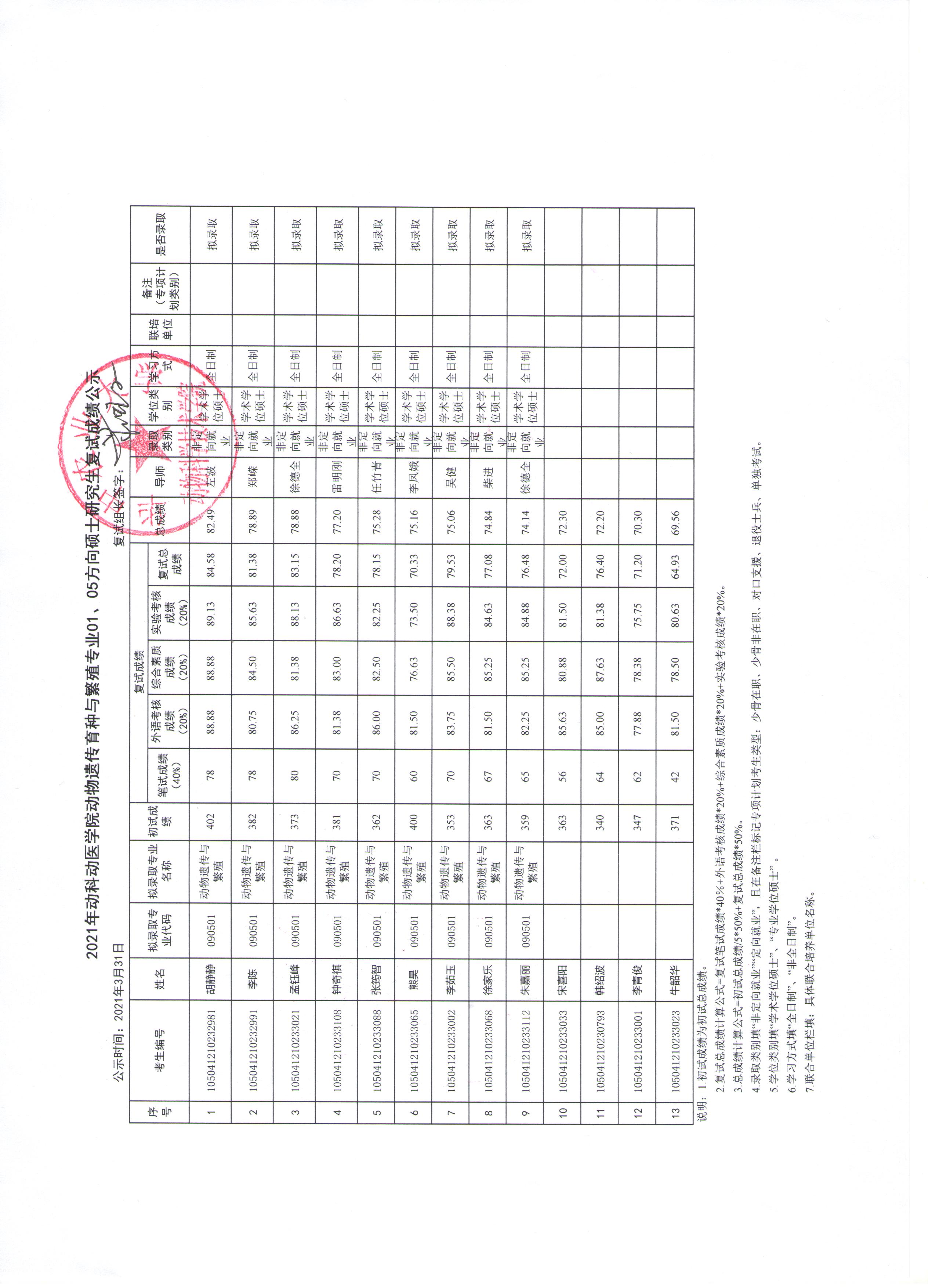 动物遗传育种与繁殖专业01、05方向复试成绩公示