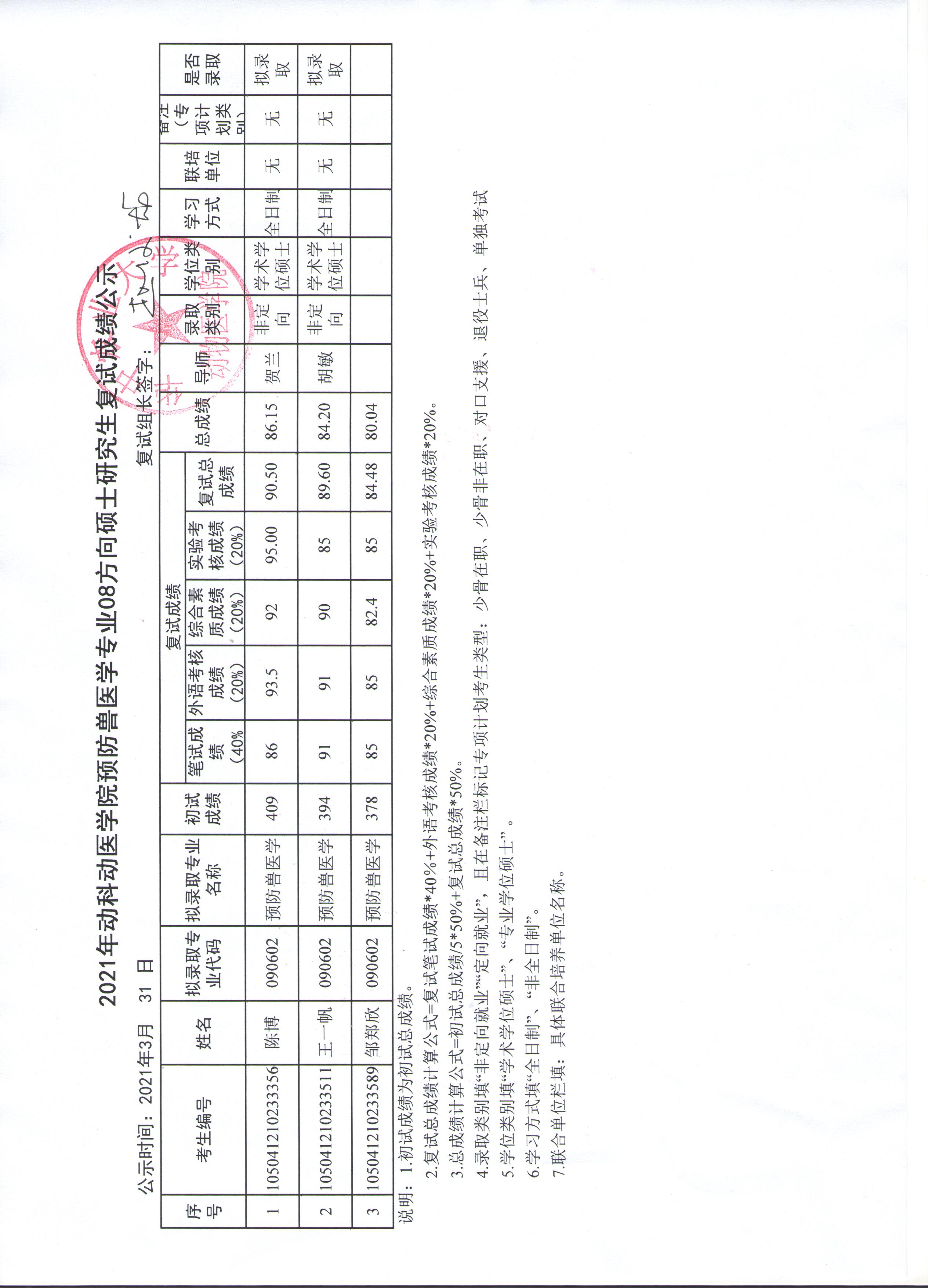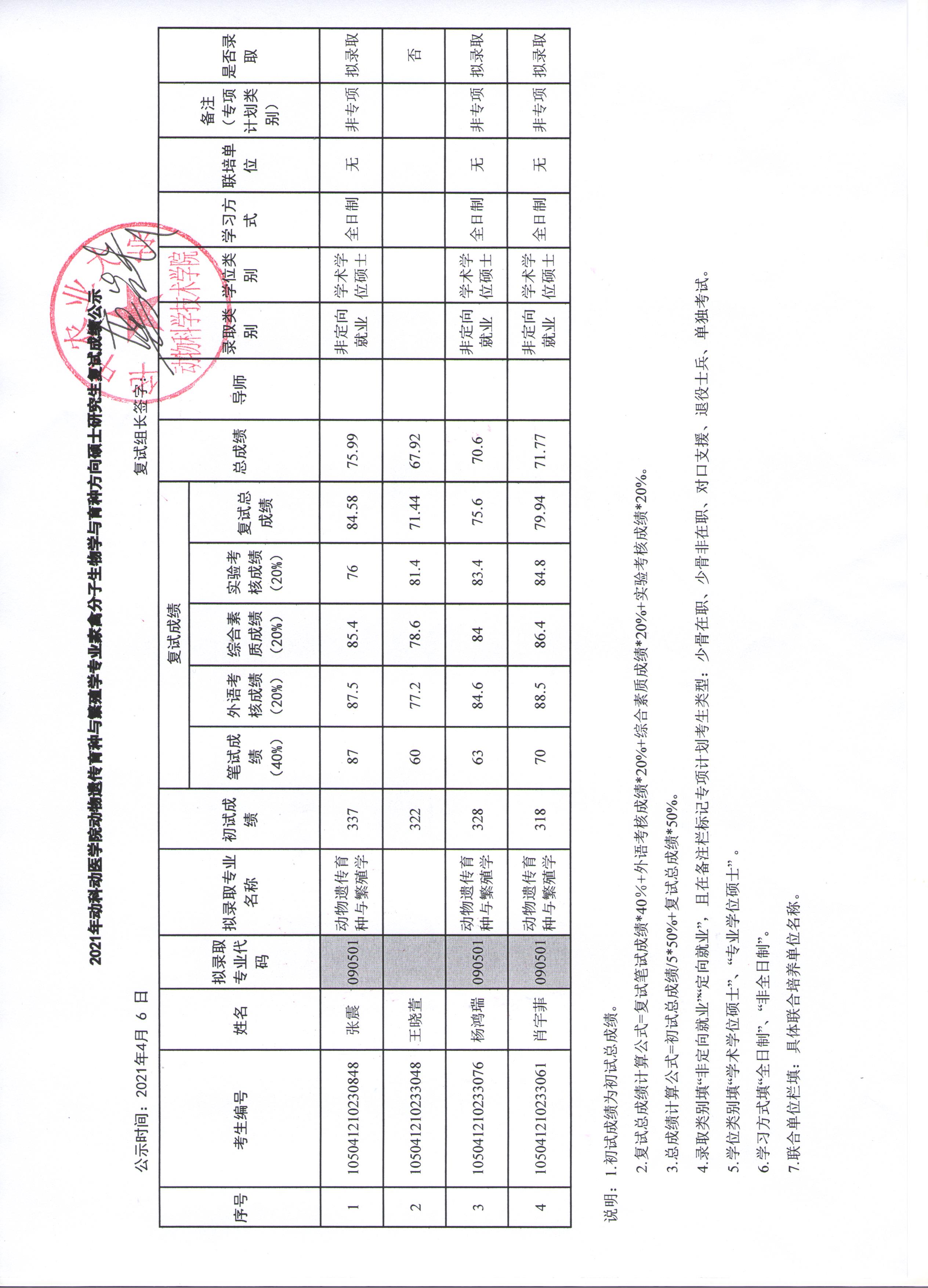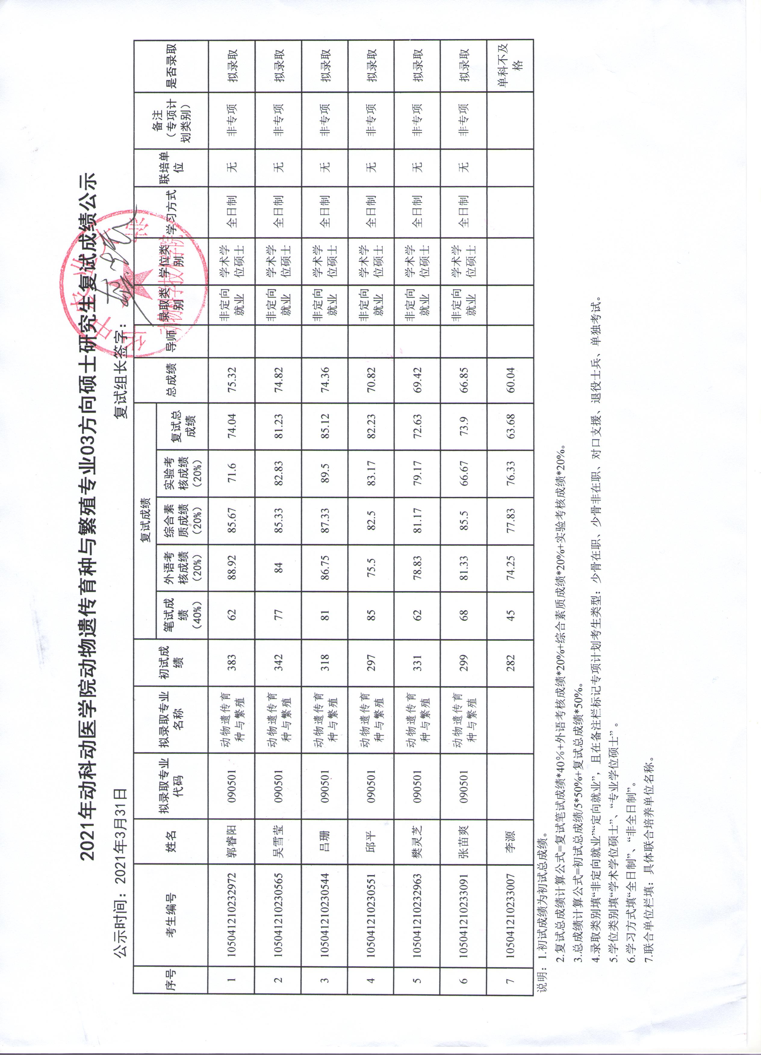 动物遗传育种与繁殖专业03方向调剂复试成绩公示