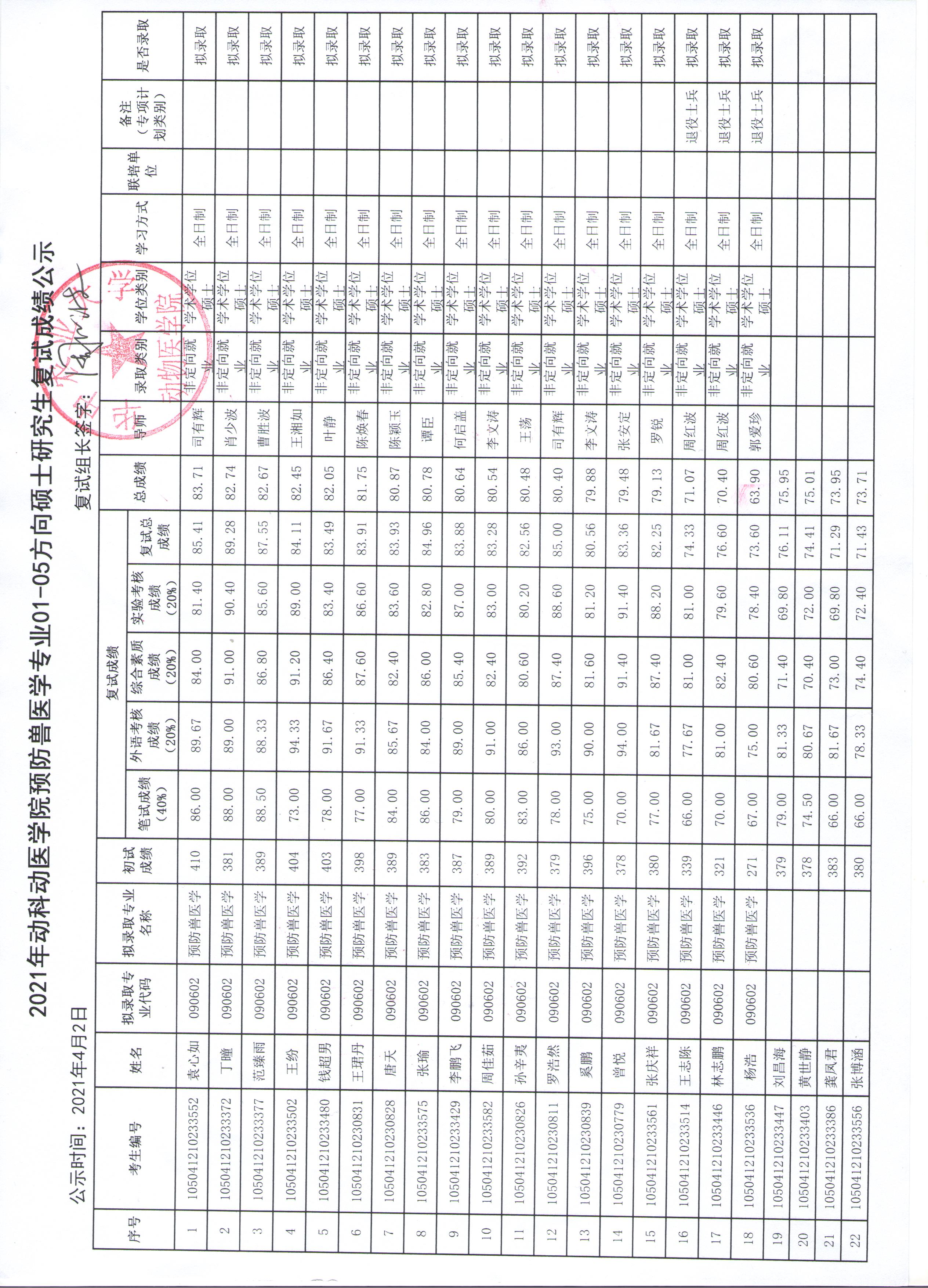 动物遗传育种与繁殖专业01、05方向复试分数线及上线名单
