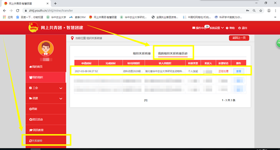 5.提交完毕后,可在“团组织关系转接”“我的组织关系转接历史”中查看状态。