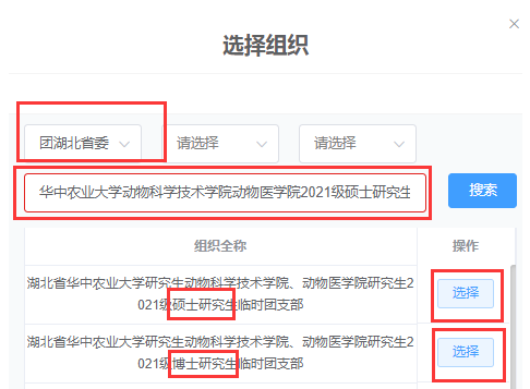 注:选择组织界面只选择“团湖北省委”即可,后面请勿选择“团武汉市委”,后面请勿选择“团武汉市委”,后面请勿选择“团武汉市委”,否则会出现搜索不到的情况。