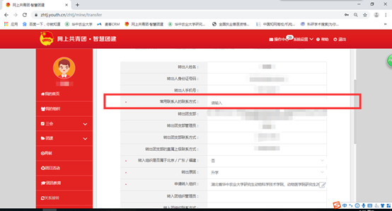 (3)原团组织关系所在支部(本科阶段团支部或硕士阶段团支部)管理员或个人登录“智慧团建”系统,点击左侧一栏“组织关系转接办理”,点击“办理转出”,填写相应信息,办理网上组织关系转接;