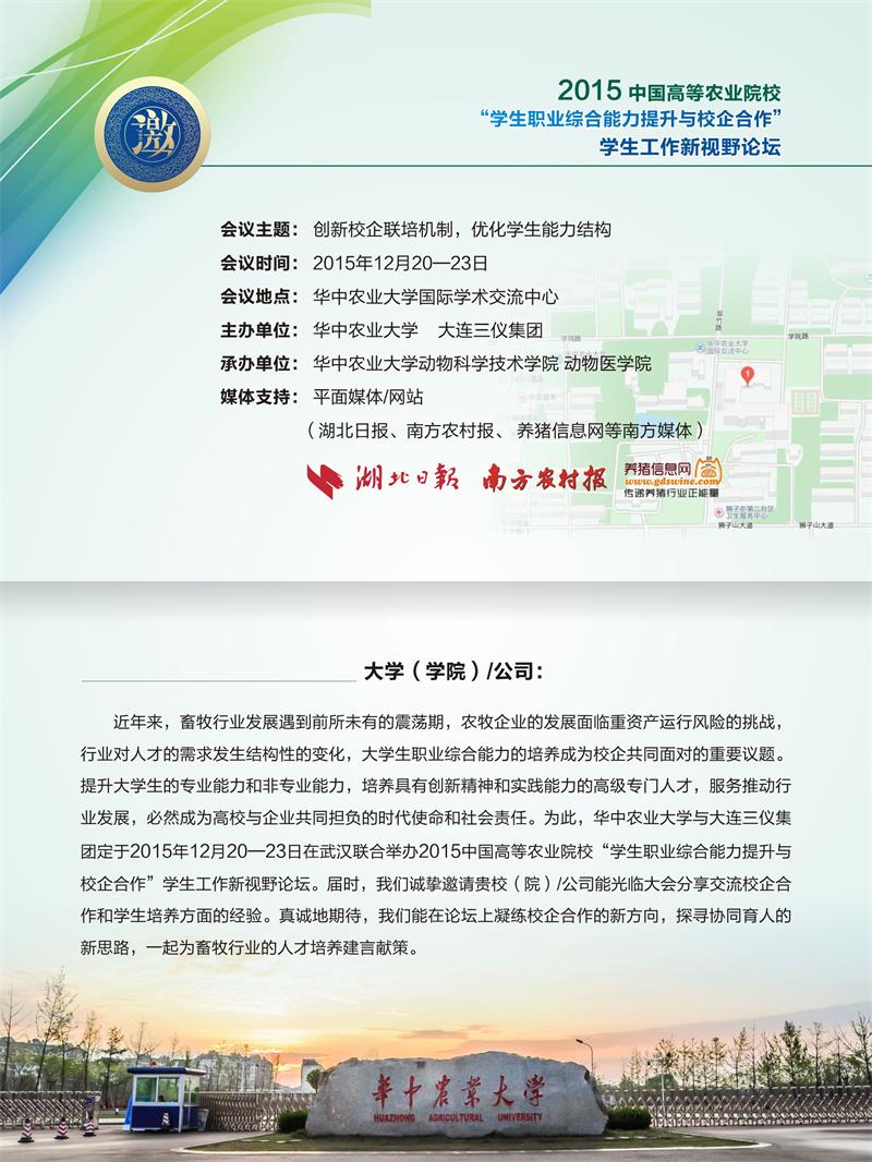 近年来,畜牧行业发展遇到前所未有的震荡期,农牧企业的发展面临重资产运行风险的挑战,行业对人才的需求发生结构性的变化,大学生职业综合能力的培养成为校企共同面对的重要议题。提升大学生的专业能力和非专业能力,培养具有创新精神和实践能力的高级专门人才,服务推动行业发展,必然成为高校与企业共同担负的时代使命和社会责任。为此,华中农业大学与大连三仪集团定于2015年12月20—23日在武汉联合举办2015中国高等农业院校“学生职业综合能力提升与校企合作”学生工作新视野论坛。届时,我们诚挚邀请贵校(院)/公司能光临大会分享交流学生培养和校企合作方面的经验。真诚的期待,我们能在本次论坛上凝练校企合作方向的分享并探寻育人新思路,一起为畜牧行业人才培养建言献策。