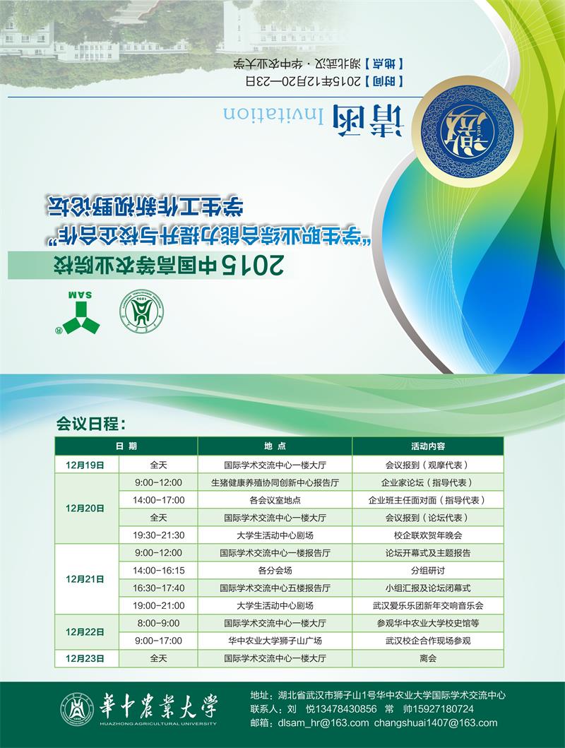 备注:12月20日华中农业大学动物科学技术学院 动物医学院举办第十四届企业家论坛,有意向观摩的院校代表,可提前在12月19日报到,同时参加第二日相关活动。