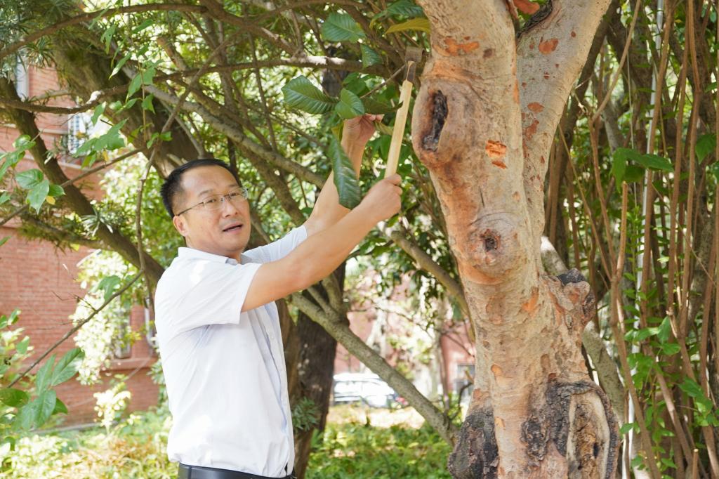“银杏作为‘活化石’,其叶片和果实有不同的功效。银杏叶活血化瘀,银杏果祛痰止咳。”王德海从校园内常见的植物入手,细致地向同学们介绍道。在狮子山脚下一路走一路看,王德海带领同学们认识了麦冬、何首乌、车前草等随处可见的草药,生动有趣的讲解令人印象深刻。他以枇杷为例,简明扼要地向同学们科普了中药绿色标本制作材料的要求、中药的炮制方法和煎药方法。