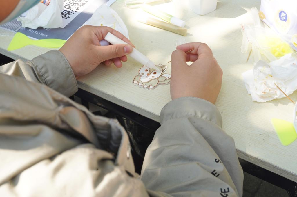 以珠“串”情,以画“传”爱。10月15日上午,牧医阳光志愿服务队于荟园主干道开展水雾魔珠和免烤胶画手工制作,吸引众多同学参与其中。