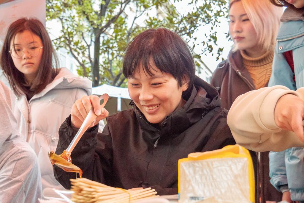 在有奖问答环节进行的同时,一旁的糖画制作组工作也在如火如荼进行着。 动医1806班的付诗懿感慨道:“校园里的糖画活动再现了儿时的玩乐场景,勾起了许多美好的童年回忆。金黄色的糖浆里流淌着的不仅仅是童趣,更是一代又一代手艺人的传承和坚守。”