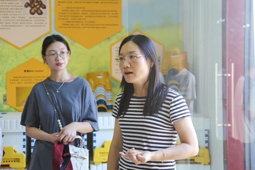 新生们在讲解员娄群的带领下前往外展厅观看蜜蜂模型。通过琳琅满目的展品,娄群向新生们详细介绍了蜂蜜、蜂胶、蜂蜡、蜂毒、蜂王浆、蜂花粉等产品的来源、制作方式及主要用途。其中,关于蜂毒的介绍引起了到场新生的兴趣。蜂毒是工蜂尾部螫刺腺体中排出的毒汁,蜜蜂蜇人而产生的疼痛就来自于蜂毒。同时,蜂毒也可用作药物治疗疾病,蜂毒疗法就是其一种应用。“蜂毒具有祛风除湿的功效。如果不小心被蜜蜂蛰到,可能对身体有着意想不到的好处”,娄群幽默地说道。