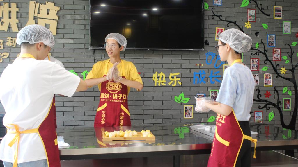 团队成员彭浩聪细心提醒成员们:“将皮料揉搓成团状,使其保持较好的韧性是接下来的关键。”其余成员向他看齐,边看边模仿,将皮料置于手掌心处按压,使其薄厚均匀地摊成圆饼状。看着馅料被皮料均匀包裹住,全体成员脸上都露出满意的微笑,对着彼此点点头,便更带劲地将其揉搓成球。取来方形模具,将其用手心平整地按压嵌入模具。最后,放入烤箱烘烤,随着香甜的气味再次萦绕,团队成员心花怒放,心中充满了成就感。