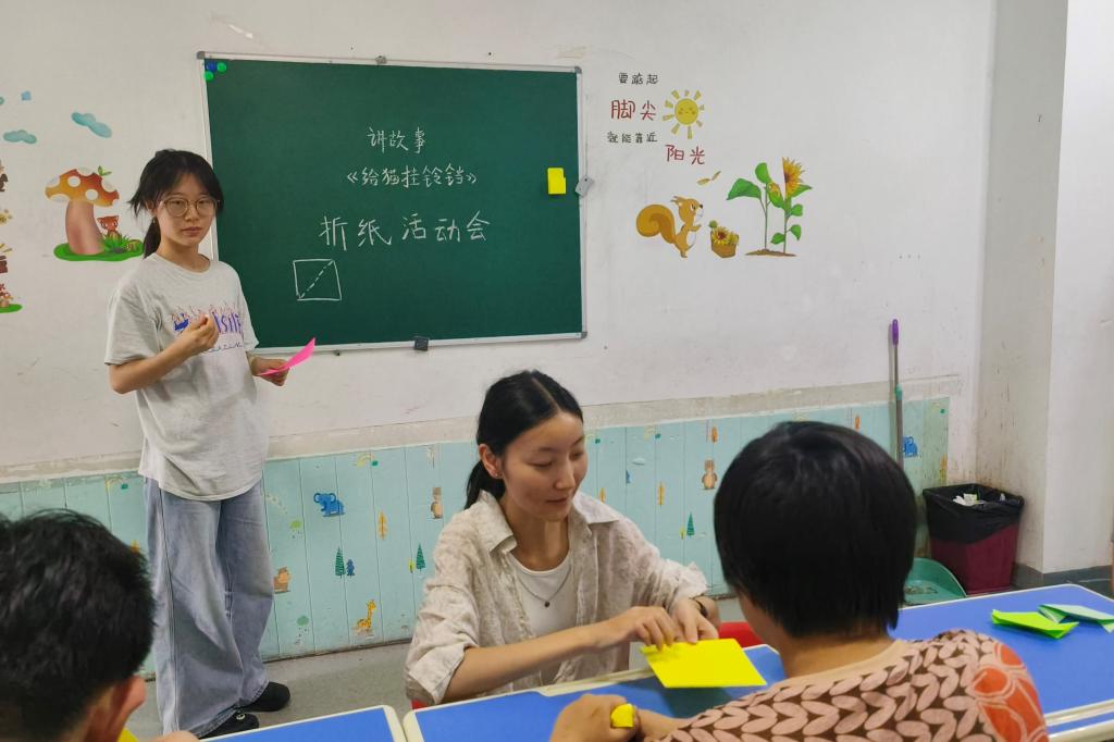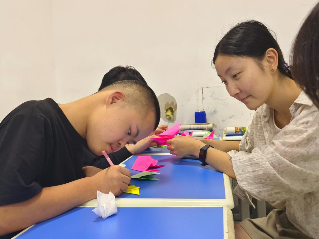 在实践队员的悉心引导下,孩子们的小手逐渐展现出惊人的灵巧。他们认真地折叠每一张纸,思考下一个步骤。当一个作品在他们手中诞生。孩子们都会迫不及待地展示给实践队员看,那份成就感与喜悦仿佛点亮了整个房间。实践队员们用他们的耐心与关爱,为孩子们搭建了一个温暖的成长平台。在实践队员的陪伴下,孩子们逐渐学会了表达自己的想法和感受,他们的社交能力得到了显著提升。
