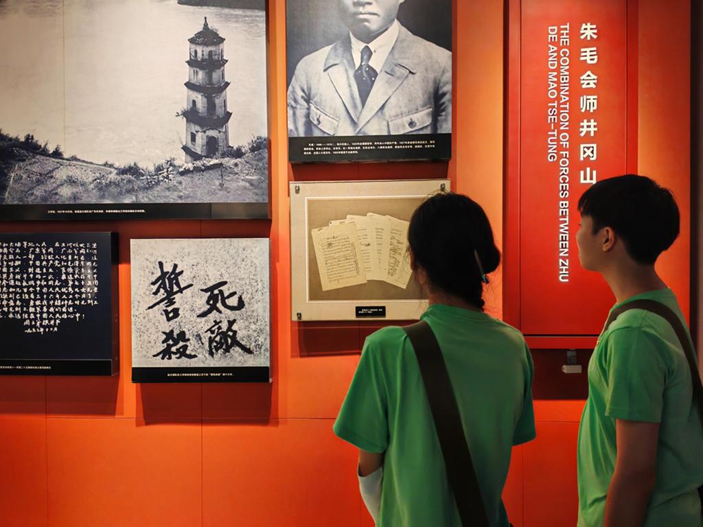次日上午,实践团队跟随基地老师,前往井冈山革命博物馆进行参观。在讲解员的引导下,学员们依次参观了四个展厅和五大部分,通过实物展览、影像资料以及虚拟现实技术,全面了解了中国共产党领导下的井冈山斗争史。观先人之事迹,筑青年之信念,同学们在毛泽东与朱德同志的雕像前,齐声喊出:“星星之火,可以燎原。”