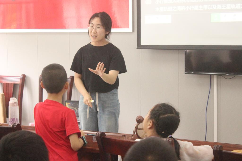 随后,焦佳利逐一介绍了太阳系的各大行星,着重强调了八大行星的名称和特点。从离太阳最近的水星开始讲述,当谈到火星时,他不仅介绍了火星的红色外观和干燥气候,还重点讲解了近年来火星探测任务的成果,以及火星上可能存在的生命迹象,引发了小朋友们对火星探索的浓厚兴趣。