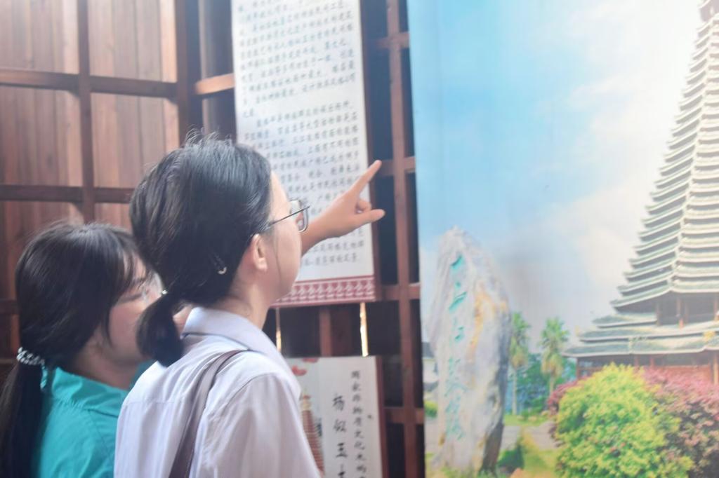 三江鼓楼以其独特的木结构闻名,采用了传统的榫卯工艺,无需一钉一铆即可搭建起坚固的建筑。在鼓楼内部,实践团惊叹于繁复精美的雕刻和层层叠叠的飞檐,这些精致的工艺展现出侗族工匠的卓越技艺和审美情趣。工作人员向考察团详细讲解这些工艺的制作过程以及其背后的文化寓意,进一步加深实践团成员对侗族建筑文化的理解。