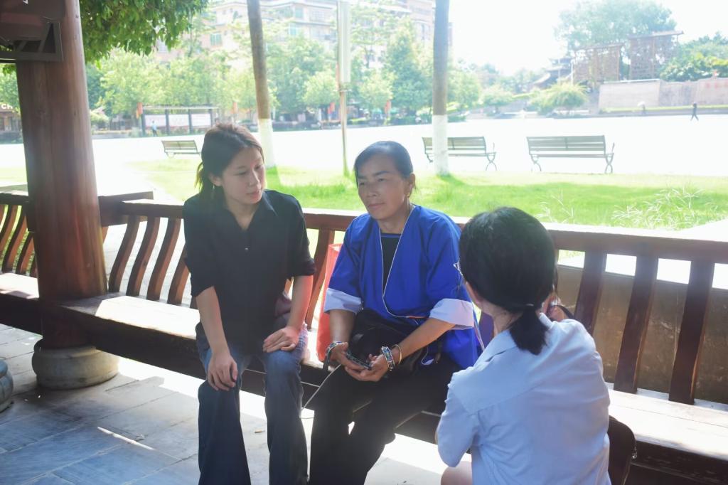 在采访过程中,三江鼓楼工作人员向实践团详细介绍鼓楼的建造历史及其在村民日常生活中的重要作用。通过与当地居民的交流,实践团了解到,每一个村寨都有其独具特色的鼓楼,鼓楼作为村寨的象征,不仅是议事、聚会和娱乐的中心,也是传承民族文化的重要场所。三江鼓楼的历史映射出侗族人民的生活变迁和文化传承,成为当地独特的文化名片。