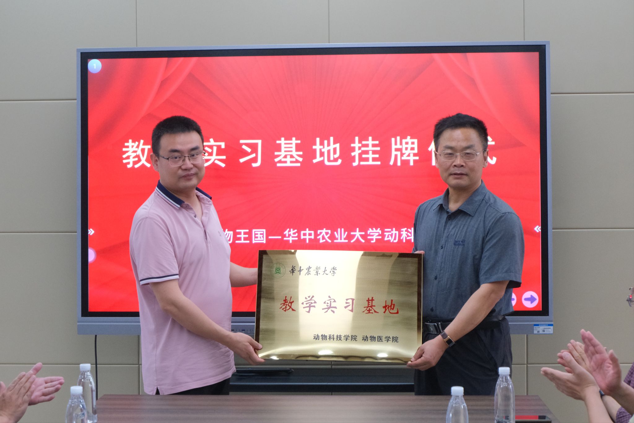 (通讯员:殷千懿 摄影:畅炯锞)4月19日上午10时,华中农业大学动科动医学院与武汉动物野生王国共建教学实习基地签约及授牌仪式在武汉动物野生王国会议室举行。动科动医学院副院长李家奎与武汉西湖动物王国旅游有限公司董事长朱彦飞代表双方签署协议书,李家奎为基地授牌。