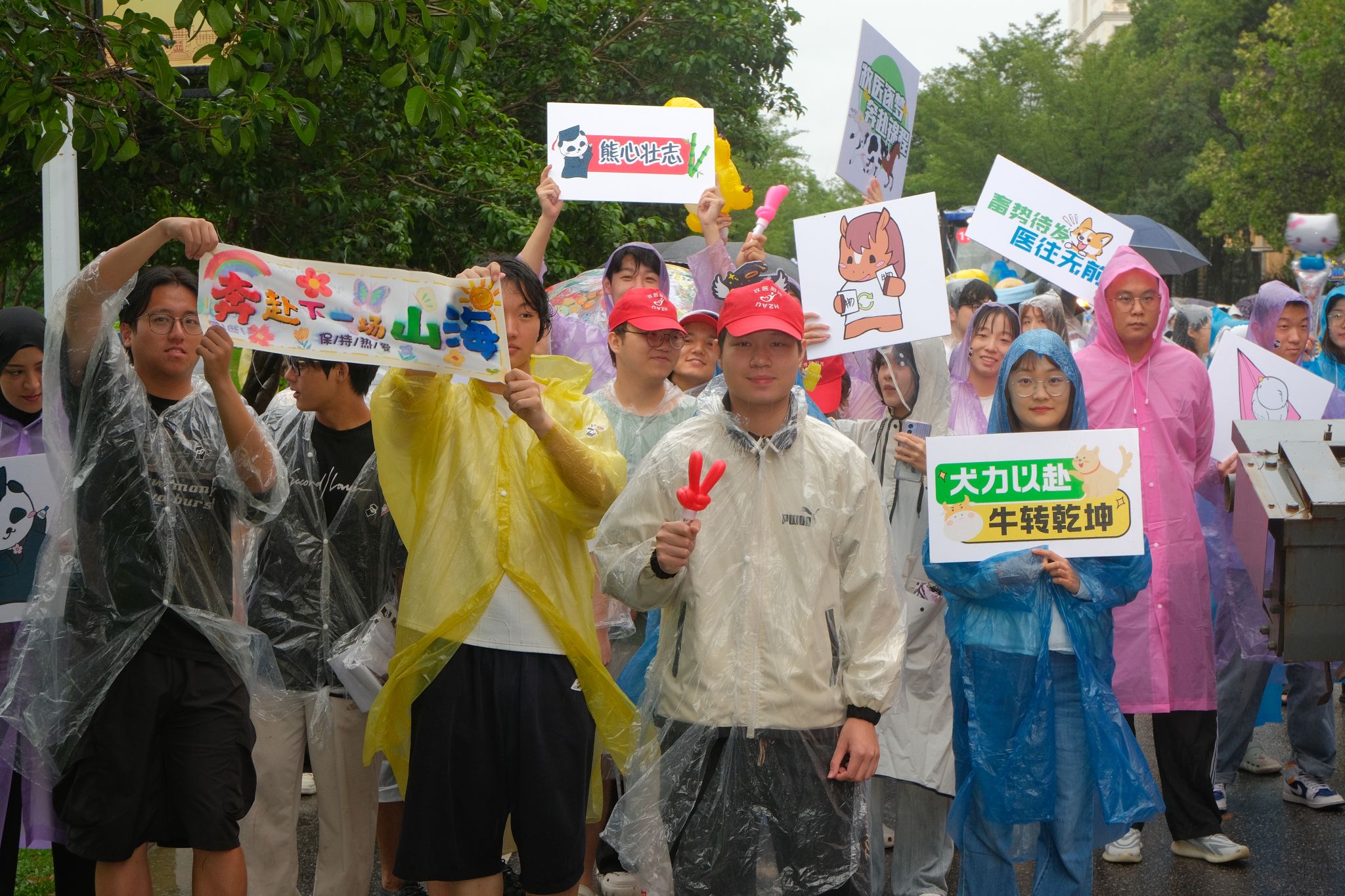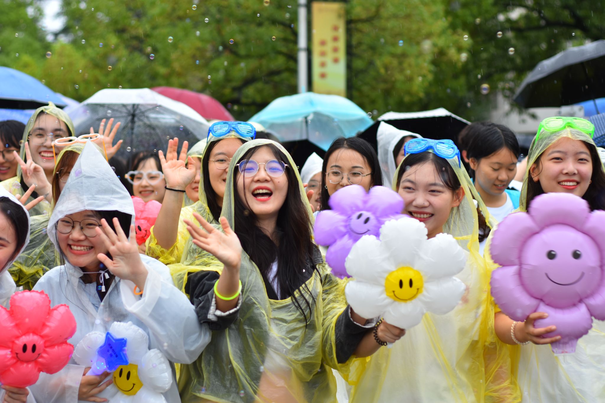 瓢泼大雨中,参与巡游的牧医学子仍热情饱满。他们手持各类应援物品,脸上洋溢着青春的笑容,跟随着花车的行进轨迹,高喊“毕业快乐”。动科2301的李雪说道:“这次巡游活动让我感受到了动科动医学院不一样的风采,花车的造型设计的很用心,同学们也非常有活力。”
