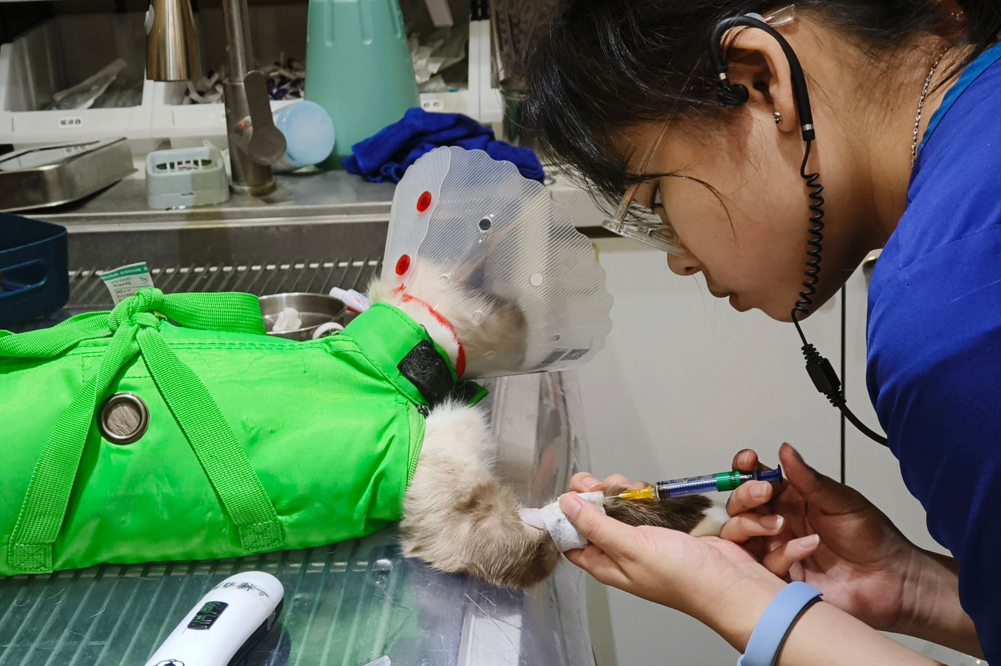 在希望动物医院徐东院区的夜班实践中,实践团队主要承担了住院部动物监护与治疗辅助工作。团队成员在带教医生指导下,重点负责保障住院动物夜间安全,密切监测其生命体征,防范突发状况发生;同时,协助医护人员为需要持续治疗的动物进行输液操作,包括核对药物、配制输液液体、调整输液泵参数以及观察输液过程中动物的反应。带教医生强调,夜间监护要求高度的责任心和细致的观察力,确保每只住院动物得到持续、稳妥的照料。