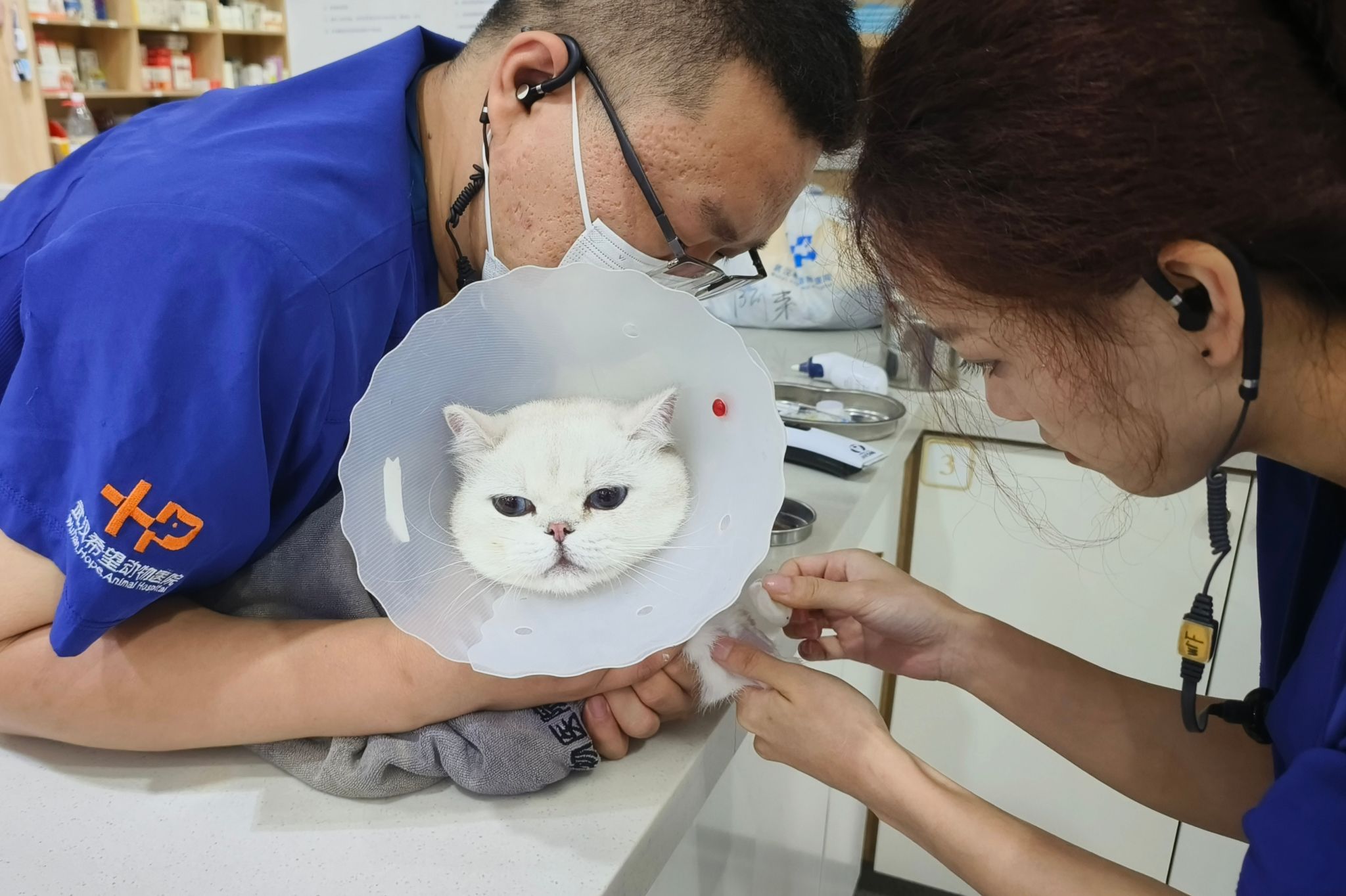在夜班实践中,带教医生向队员演示了猫咪静脉采血前的消毒操作。医生强调酒精消毒是暴露血管、确保采血成功和预防感染的关键步骤。队员们观察到医生使用酒精棉球在猫咪前肢仔细擦拭,从而使目标血管清晰显现。