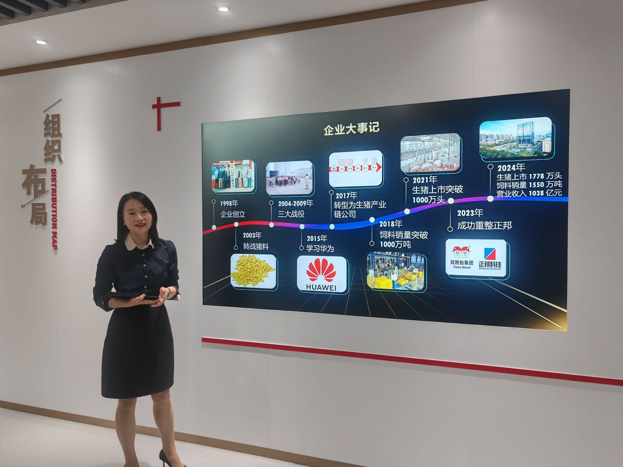 在快速发展的同时,集团始终顺应时代潮流。通过廖老师的讲解,成员们了解到,集团近年来积极推进数字化转型,运用人工智能技术实现了养殖、营销等环节的实时监控与智能化管理。作为国内农牧产业的龙头企业,双胞胎集团勇于探索前沿科技,凭借开拓魄力与过硬实力,显著提升了生产效率和生物安全防控水平。