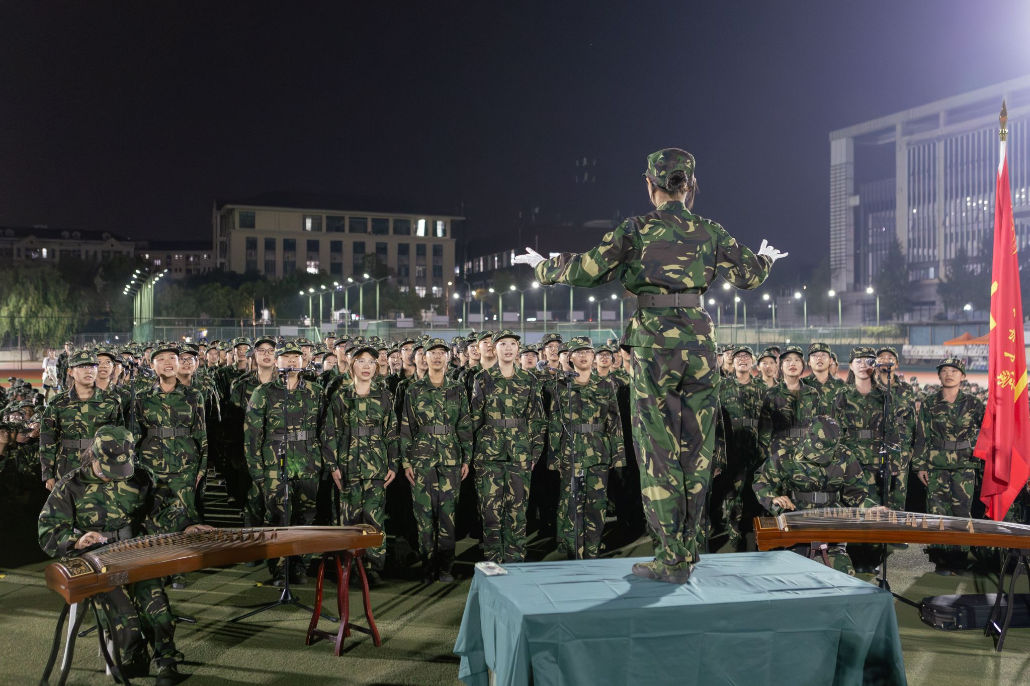 “万泉河水清又清,我编斗笠送红军,军爱民来民拥军,军民团结一家亲一家亲。”十二团女生队伍列队整齐,在指挥白手套划出的节奏中,嘹亮的歌声与古筝旋律交织共鸣。古筝的婉转音色衬托着牧医学子们饱含情感的演唱,展现了革命年代军民互助的温情画面。“我编斗笠送红军”的歌词响起时,清晰的咬字、饱满的情感勾勒出军民鱼水情的画面。琴音时而轻柔舒缓,时而抑扬顿挫,与合唱的强弱起伏契合,呼应“军民团结打敌人”的铿锵誓言。