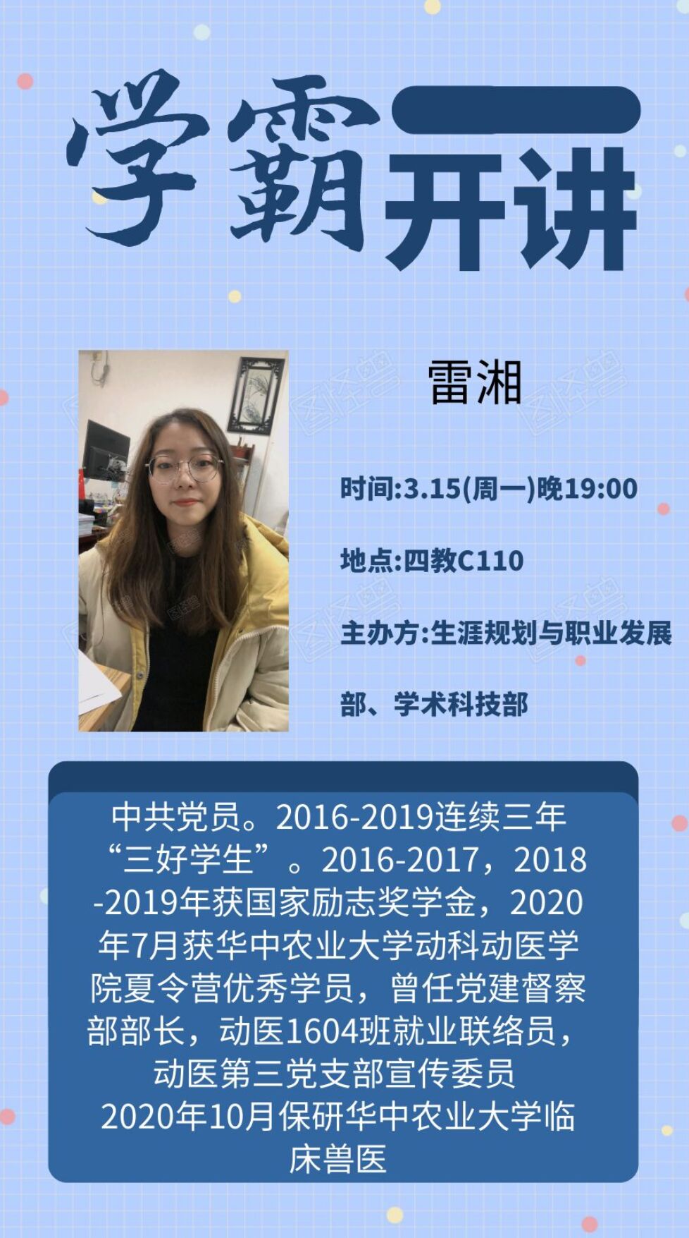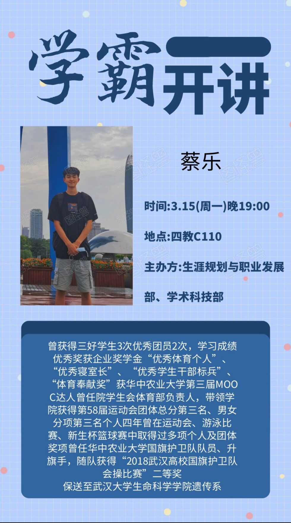 三月十五日晚七点,将在四教C110由生涯部与学科部联合举办的本学期学霸开讲活动举行,有幸邀请到了来自动科17级蔡乐学长以及动医16级雷湘学姐,韩崇学长来分享他们的学习经验。本活动旨在为低年级同学提供一些建议与指导,欢迎各位感兴趣的同学前来参与。