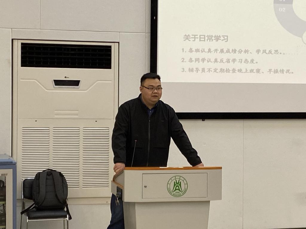 新学期重点事项是会议第二部分内容。首先,2021年是中国共产党建党一百周年,谭力铭希望同学们能够积极向党组织靠拢,认真参与党的理论学习,参加各项学生工作,体现自我价值。接着,谭力铭通过对各班断层成绩数据的分析,要求同学们加强班级学风与班风的建设。谭力铭表示,为了督促同学们规范作息,他将不定时查寝和查操,并着重提醒了夜不归宿与旷操的严重后果。随后,谭力铭提出了暑期社会实践“早准备、先组队”的建议,并向同学们推荐了“武汉市青年下乡”与“暑期支教”等实践活动。