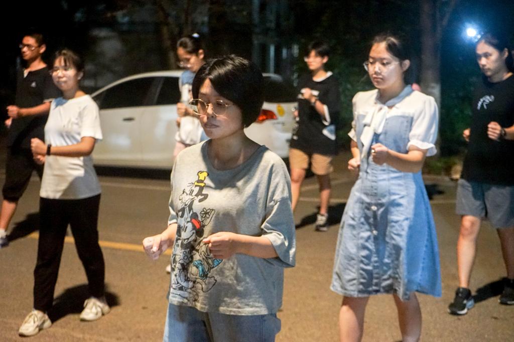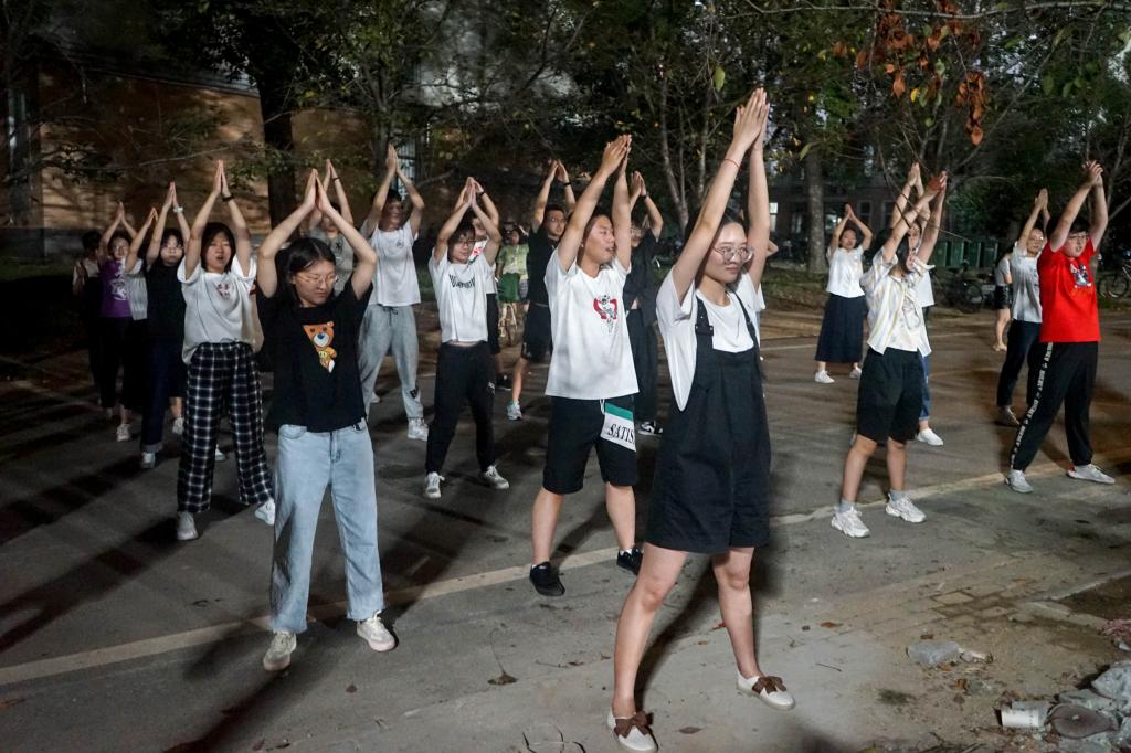 30日晚,新生们已经学完整套早操。各班排列整齐,音乐响起,他们抬手、挥臂、踢腿、收肘,动作流畅规范。遇到来往的车辆时,新生们有秩序地进行避让,随即又专心投入到“整理运动、扩胸运动……”中去,常有路过的学生停下脚步观看并赞扬同学们的优秀表现。