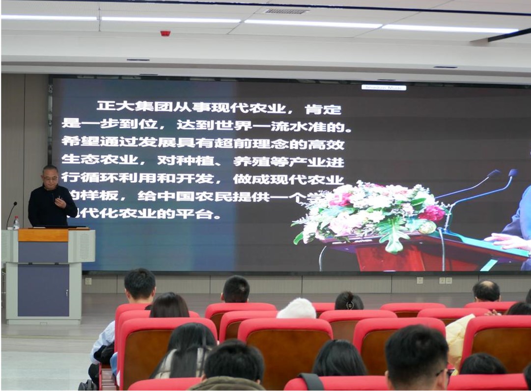 11月30日下午,正大集团中国区资深副董事长周永顺就“现代农业的现状与未来——正大集团的探索与实践”这一主题与同学们进行分享交流。他从正大集团的发展历程与价值观出发,介绍了正大集团在现代农业上的探索与创新,并分享了他对产业链的创新模式及对未来发展的思考。他强调,正大集团秉持“利国、利民、利企业”的“三利原则”,坚持以快速优质、化繁为简、接受变革、不断创新、正直诚信为导向,为国家和世界输出优质食饮产品。他认为,现代农业是需要用现代工业装备的、用现代科学技术武装的、用现代组织管理方式经营的社会化和商品化农业。现代农业发展要实现最有效利用自然资源、最大可能利用科学技术、最大可能地规模化生产、最大效率提高经济效益、最有效的保护生态环境、最大程度地市场化运作。此外,在交流提问环节,周永顺指出,参加工作的前几年是一个人学习和积累的黄金成长期,鼓励同学们要抓住这段时期,脚踏实地、厚积薄发。